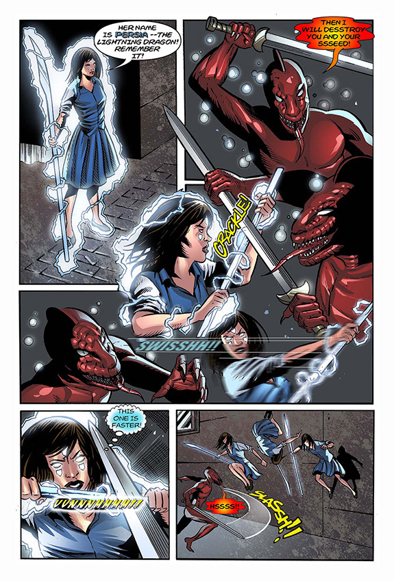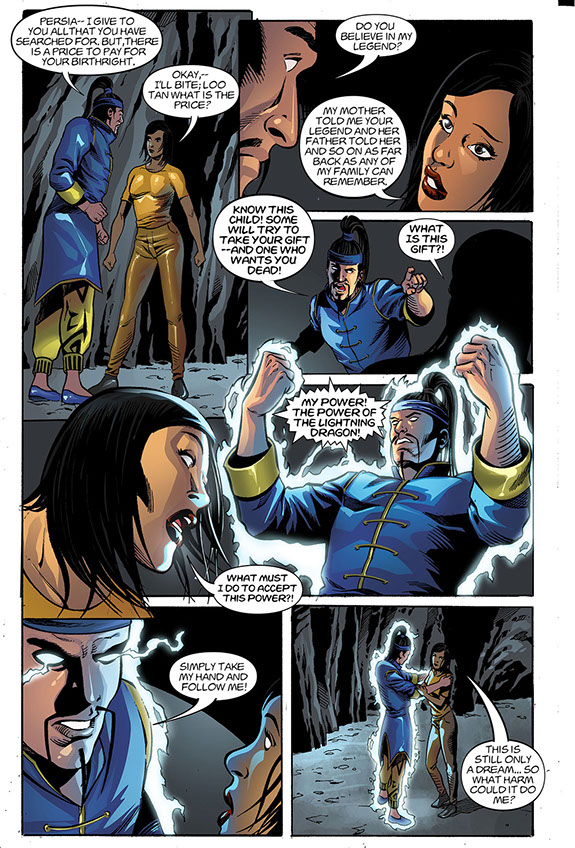 Having survived a horrific afternoon on the eve of her Xia dynasty exhibition, Persia settles in for a good night sleep. Only to be confronted by her destiny told to her by YING LONG, the Chinese Rain Dragon in her dream. Upon awakening, Persia discovers she has the powers of the LIGHTNING DRAGON! But how to control them? Enter Loo Tan her ancient ancestor; and now personal trainer. On the other side of the world Persia’s nemesis, the BLACK DRAGON and his minions, grow in strength. Preparing for the final confrontation!